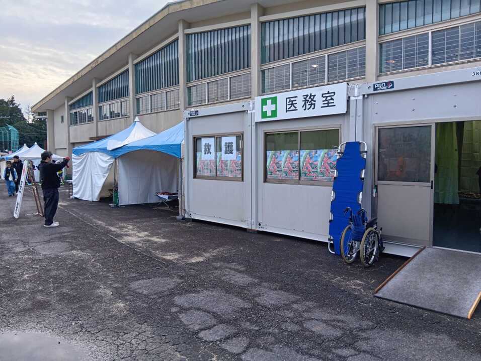 ゴールから約50mの医務室(救護室)はコンテナ3個分の仮説事務所のような作りです。その中でにストーブを焚いて周囲にカーテン付きの4床、昨年の反省を踏まえて屋外テント2つ分にシーツのカーテンで仕切ってさらに4床を追加し、さらに病院の救急車も緊急時の処置スペースとして隣に置きました。ここに医師(以下Dr)1名+看護師さん(以下Ns)4名が詰めて万全の体制でした。さらに昨年からは、民間救急会社アンビュランスさんの救急車2台と10名の人員(救急救命士+Ns+運転手)が配置され、自分が参加した10年前に比べAEDの数も大幅に増えていました。またランナー公募とともに有資格者(Dr+Ns+救急救命士)である「メディカルランナー」も登録頂き、その数40名とのことでした。